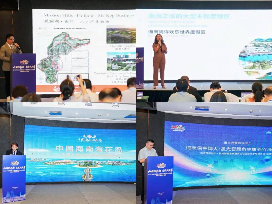 在重点存量项目推介环节,海口观澜湖旅游园区、儋州海花岛旅游产业园、陵水海南海洋欢乐世界度假区项目、海南保亭博大·星光智慧泉林康养谷项目等进行了现场推介,详细介绍了项目特色、发展现状与合作需求。
